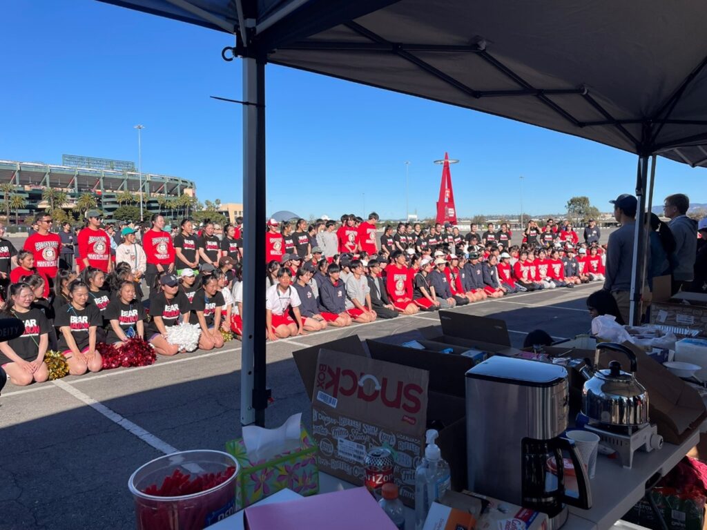 (ローズパレードに向けたマーチングの練習はアナハイムのエンジェルスタジアムの駐車場貸し切り。地元の県人会などもボランティアでお昼ご飯の炊き出しに参加)
